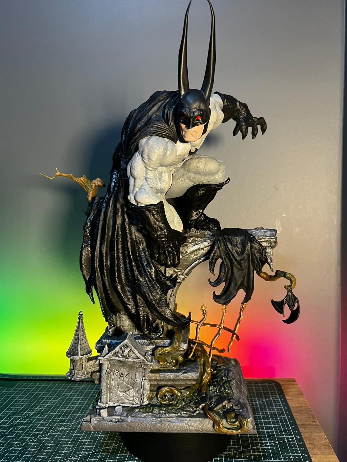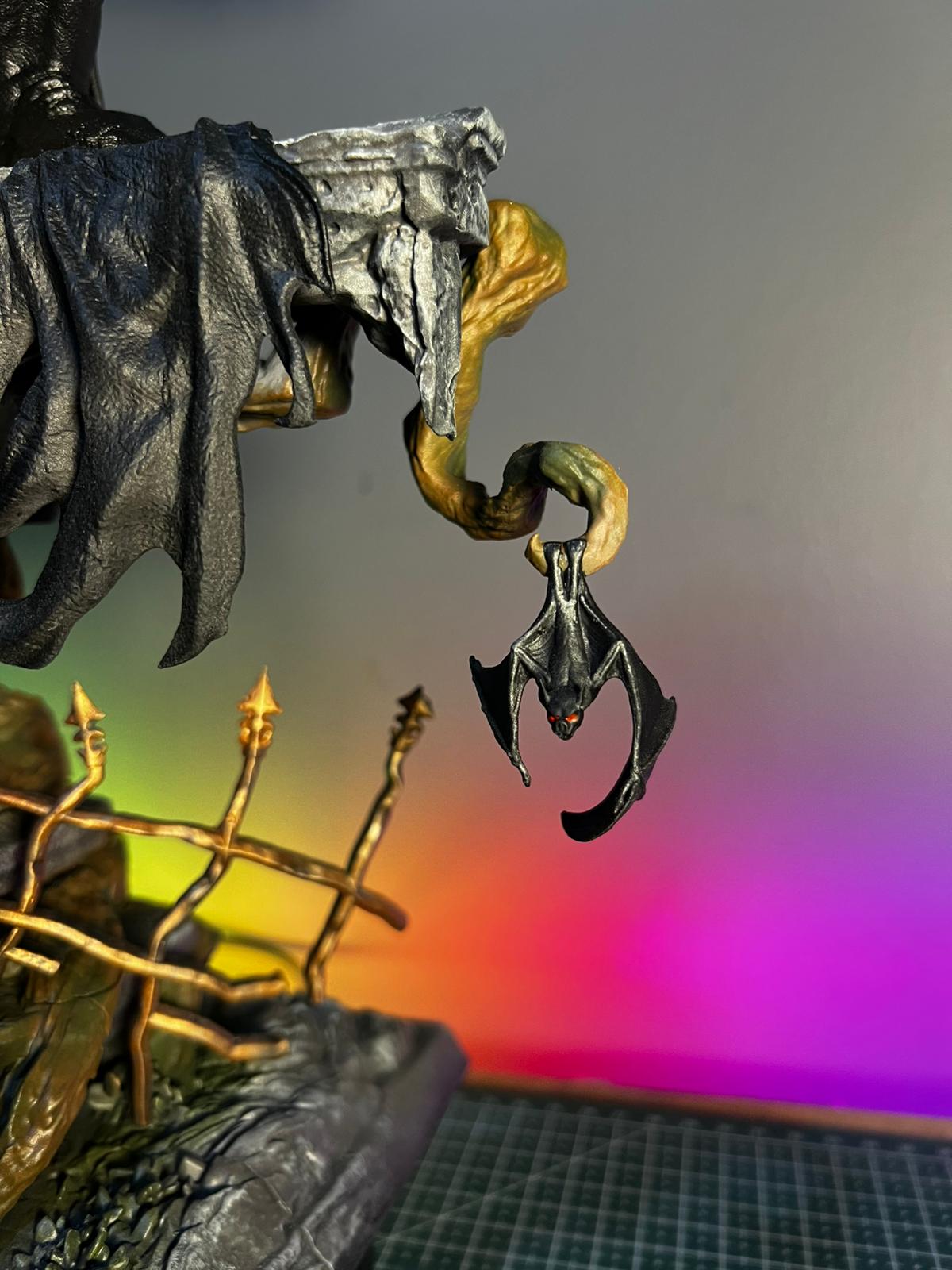 Model; yüksek detaylı üç boyutlu baskı ile üretilmiş, yüzey düzeltmeleri titizlikle yapılmış ve tamamı el boyaması olarak tamamlanmıştır. Yarasanın tehditkâr duruşu, keskin dişleri, kanat dokuları ve karanlık karakteri yansıtan detaylar; koleksiyon ve sergileme odaklı bir yaklaşımla özenle işlenmiştir.